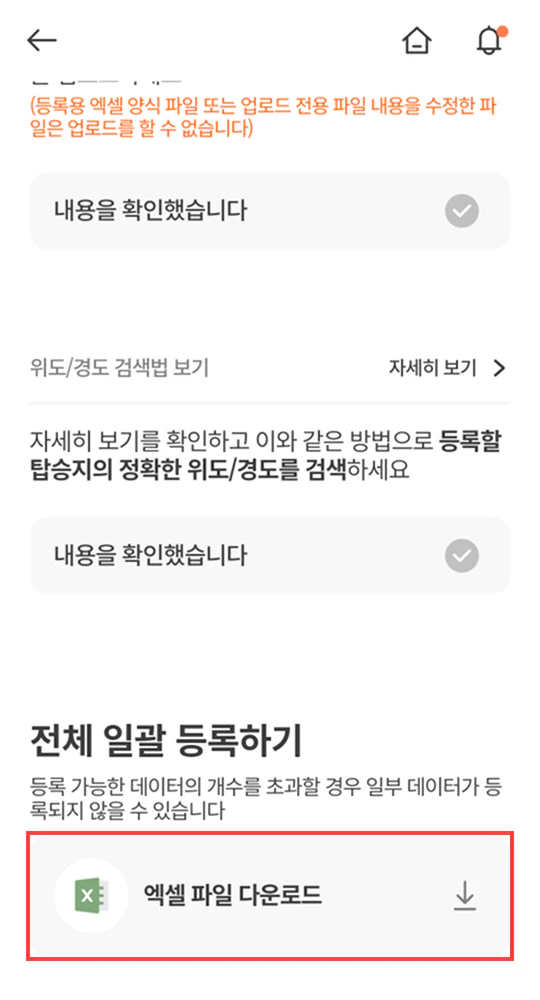 - 탑승지 : [메뉴 ≡] > [기관 정보 등록] 탭 > [탑승지] > [탑승지 등록] > [+ 파일 등록하기] 선택