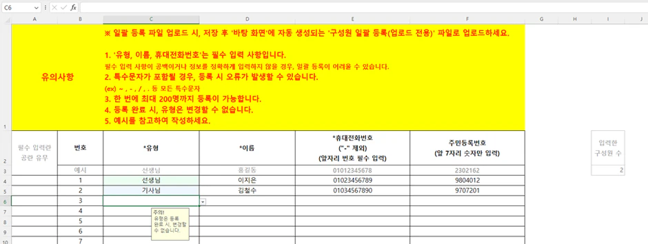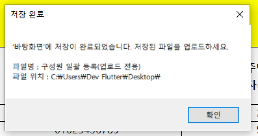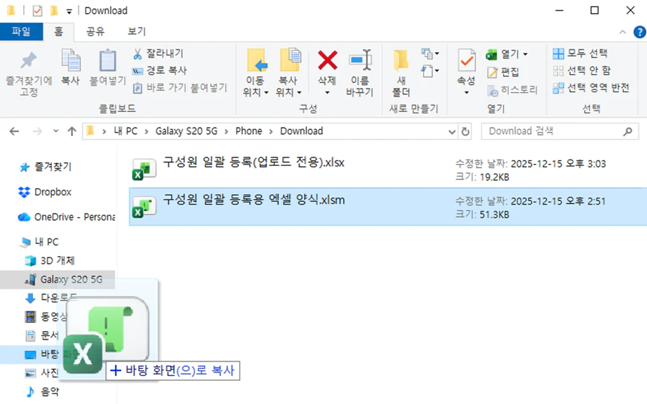 '저장' 버튼 또는 Ctrl + S 키로 저장합니다. 이 때, 자동으로 바탕화면에 '구성원 일괄 등록(업로드 전용).xlsx' 파일이 생성됩니다.