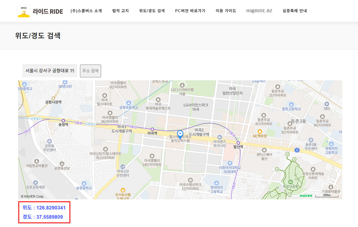라이드 위도/경도 검색으로 이동하여 주소를 입력한 뒤, 좌표를 확인합니다.