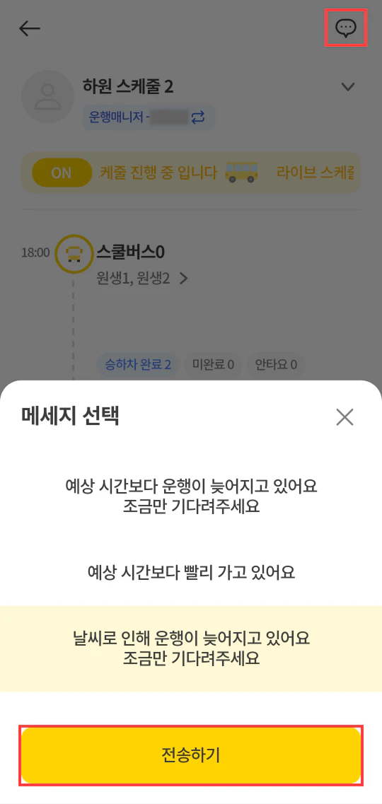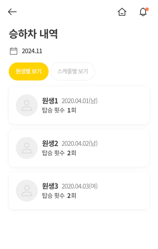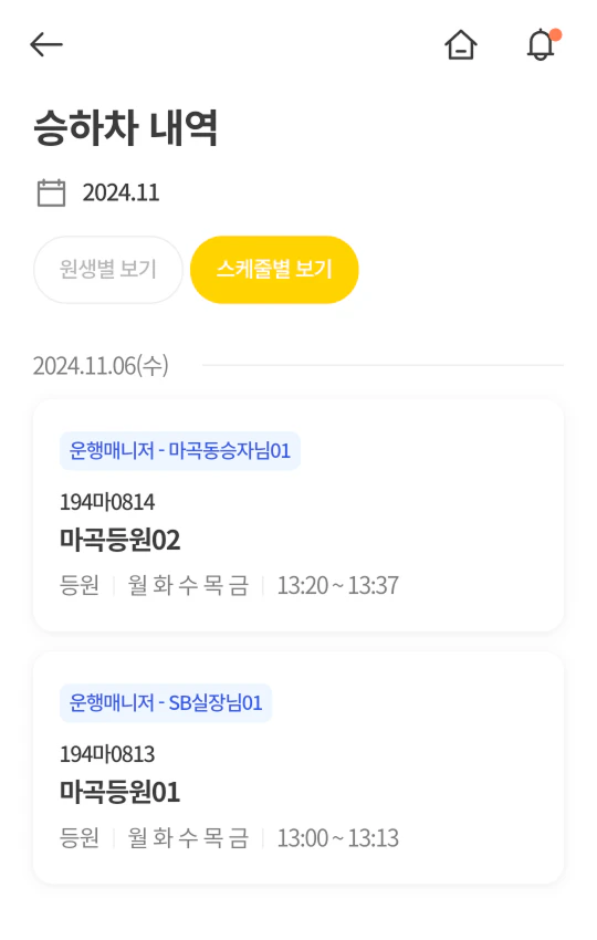 앱 이용 가이드원생 승하차 알림이 페이지에서원생 승하차 알림 승·하차 시 보호자에게 실시간으로 푸시 알림을 전송합니다. 승차 및 하차 차량 위치 라이브에서 라이브를 시작한 뒤,탑승지에 연결된 원생의 승차 및 하차를 진행합니다. 동승자님, 선생님도 기사님의 라이브에서 승차 및 하차를 진행할 수 있습니다. 메시지 운행 중 특이사항이 있을 경우 간편하게 메시지를 남길 수 있습니다. 구성원과 보호자 화면에서 확인할 수 있습니다. 승하차 내역 과거 라이브 운행 기록을 확인할 수 있습니다. [메뉴 ≡] > [라이브 스케줄 시작하기] 탭 > [승하차 내역] 선택