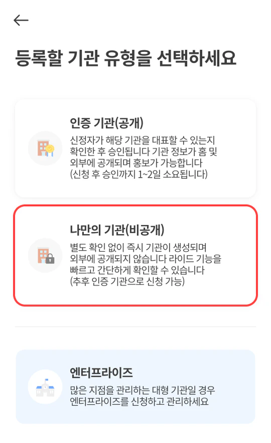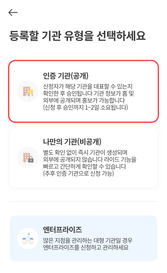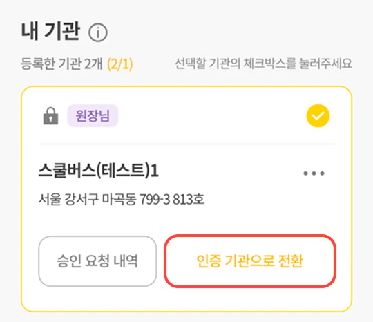 • 소속된 기관이 있는 경우 [메뉴 ≡] > [기관 승인/관리] > [+ 기관을 등록하세요] 선택