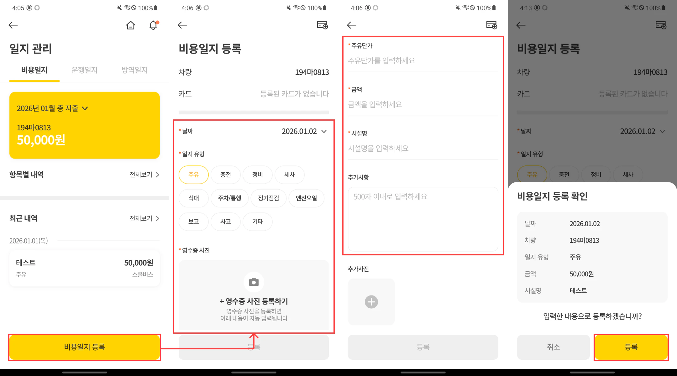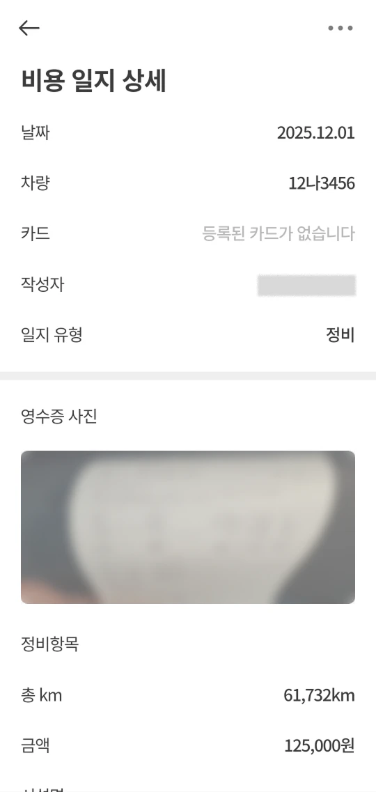차량과 관련하여 발생한 비용에 대해 영수증과 함께 기록합니다.