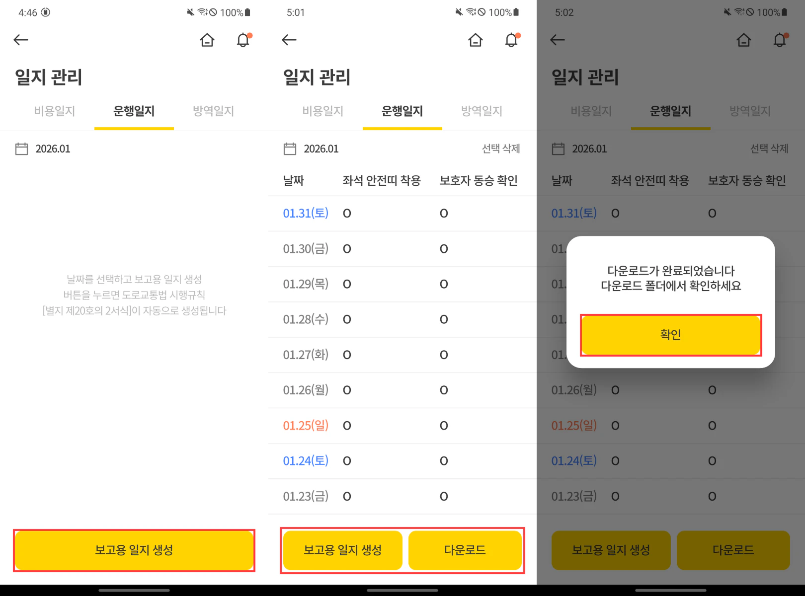 • [메뉴 ≡] > [보고서] 탭 > [일지 관리] > [운행일지] 탭 선택