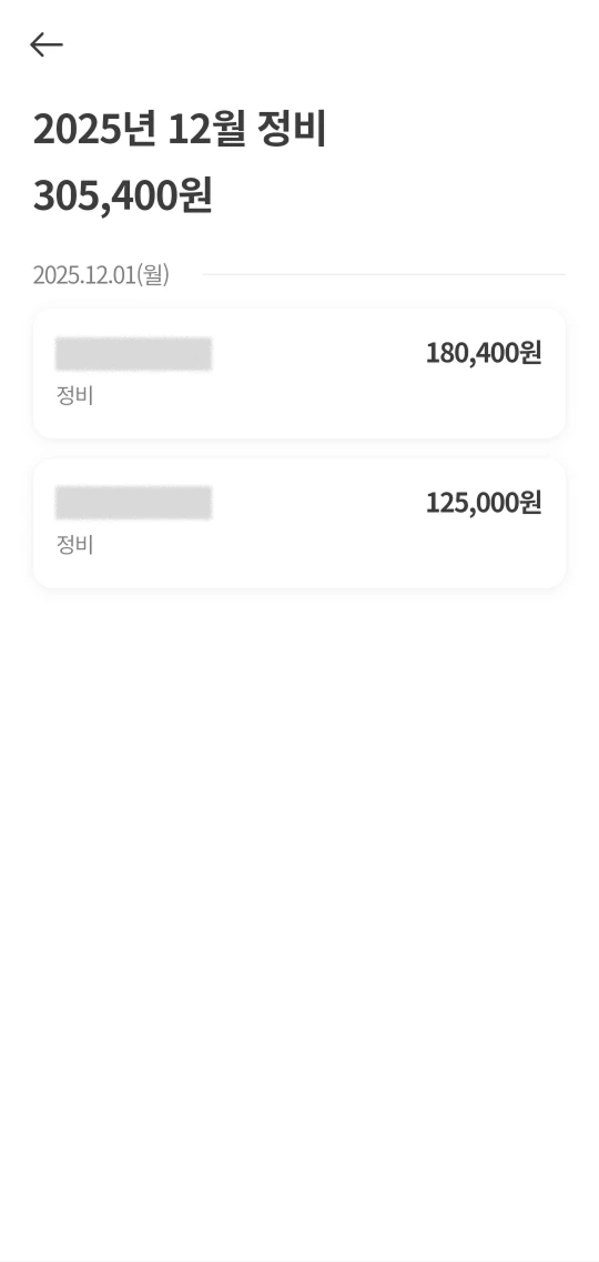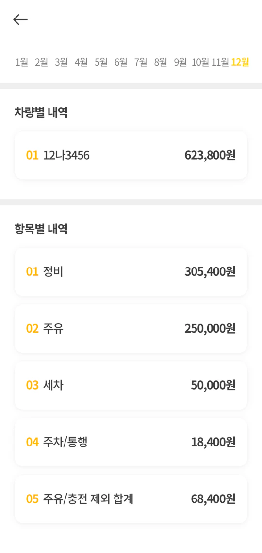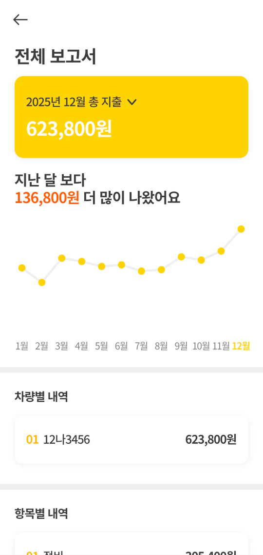 등록한 비용일지의 차량별, 항목별 합계와 상세 내역을 확인합니다.