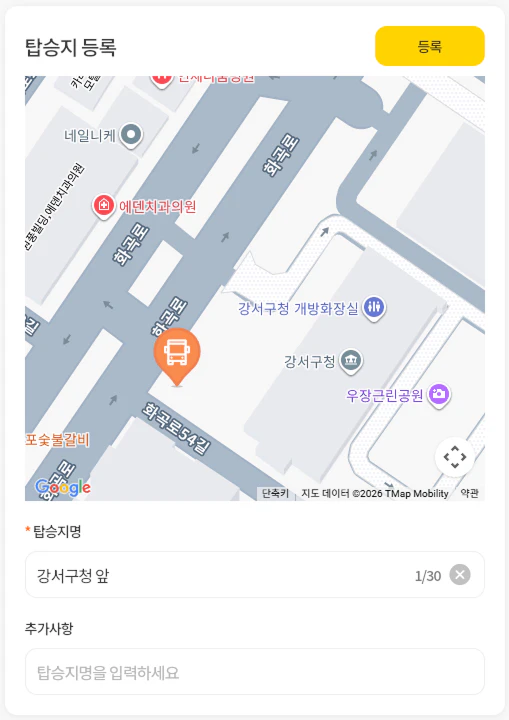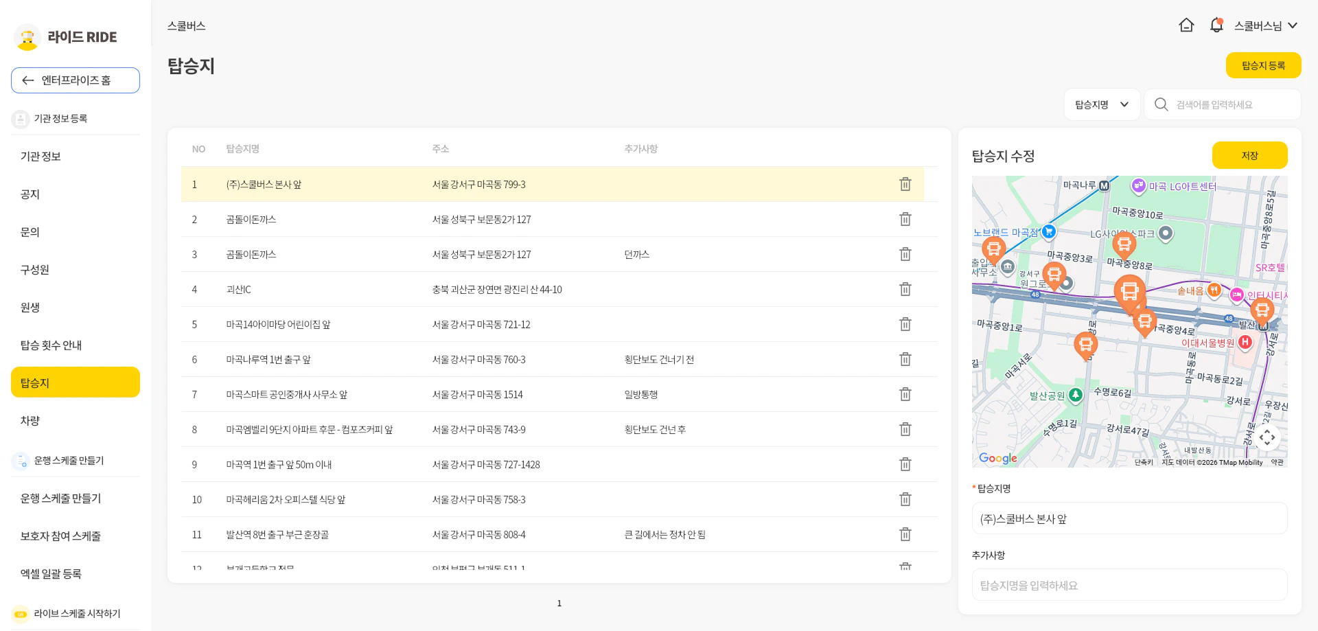PC 이용 가이드탑승지이 페이지에서탑승지 지도를 움직여 탑승지를 등록합니다. 정보탑승지는 스케줄 경로와 원생의 승·하차 위치 기준이 됩니다. 탑승지 등록 신규 등록하실 경우 우측 상단 [탑승지 등록] 버튼을 눌러주세요. 지도를 클릭하여 탑승지를 지정 후, 등록합니다. 팁우측통행을 고려하여 지도를 움직여주세요. 또한 핀 하단 뾰족한 지점을 기준으로 위치가 지정됩니다.